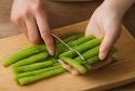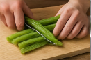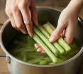 - 줄기 껍질을 벗겨 5 cm로 썬 뒤 소금을 살짝 넣은 물에 1분 데칩니다.