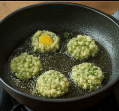 - 달걀물과 부침가루를 입혀 170 °C 기름에 1분 튀깁니다.