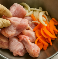 냉장 닭 1.2 kg, 감자·당근 각 200 g, 양파 150 g, 대파·청양고추 각 1개, 물 600 mL, 그리고 미리 믹싱할 양념이 필요합니다. 채소는 3 cm 큐브로 썰어야 익는 시간과 식감이 딱 맞아요. 준비 단계에서부터 닭볶음탕 황금레시피의 결과가 결정됩니다.